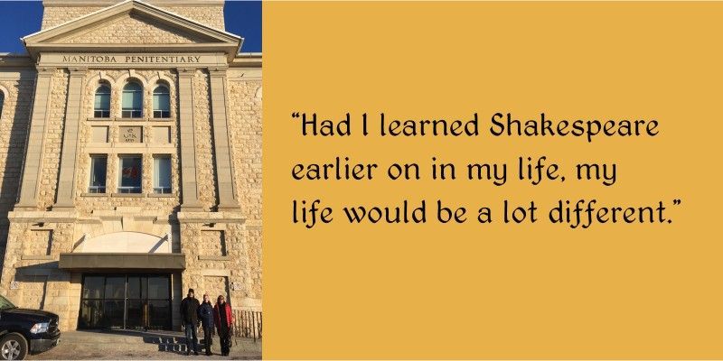This week we wrapped up our fourth Shakespeare in Stony Mountain program. Our tradition on the last class is to pick a movie, order food from the prison kitchen, and just be together in a room celebrating the hard work of the participants. I am always struck by how different the group interacts in this last session, compared to where we started months prior. There is a relaxed energy, a familiarity between us, small acts of kindness and generosity, and laughter. Lots of laughter.